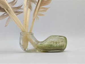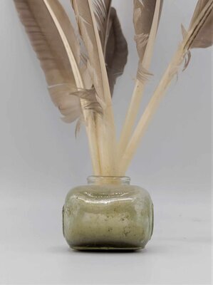Das aus Glas gefertigte Tintenfläschchen ist mit Federn ausgestattet und besitzt eine besondere Form, die ein wenig an Clown-Schuhe erinnern kann. Es ist länglich gestaltet und besitzt auf der Seite gegenüber der Öffnung einen etwas größeren Körper, der vermutlich viel Tinte fassen konnte. Zwischen diesem Körper und der Öffnung befindet sich eine Mulde. Am vorderen Teil des Fläschchens sind nach außen gewölbte Rillen auf das Glas geprägt. In das Tintenfläschchen sind sechs Federn hineingesteckt. Es ist keinerlei Prägung eines Herstellers oder eines Produktionsjahres vorhanden, aber man kann annehmen, dass es im frühen zwanzigsten Jahrhundert hergestellt wurde.