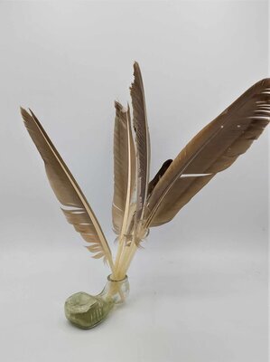 Leeres Tintenfläschchen in Schuh-ähnlicher Form mit Federn
