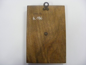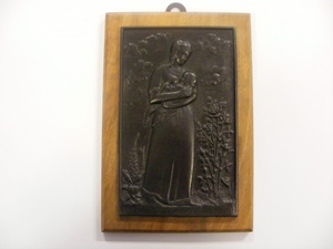 Eisengussrelief, die eine Mutter mit eine Kind auf dem Arm zeigt. Das Relief ist auf eine Holzplatte montiert.