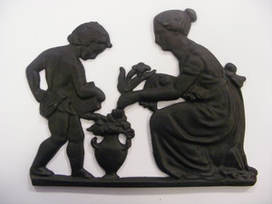 Eisenguss; Wandrelief ohne Platte; Knabe gießt Wasser in eine Blumenvase, während eine Frau mit Schürze daneben kniet und die Blumen mit einer Hand hält. Nachguss von Anton Schmidt (Concordiahütte Bendorf-Mülhofen) um 1974;