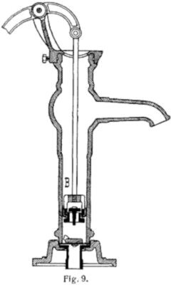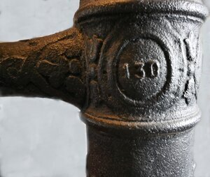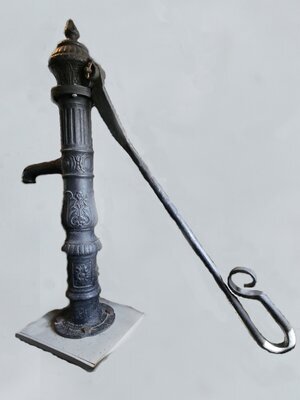 Aufwändig verzierter Schwengelpumpe mit Neo-Renaissance-Dekor, langem Hebel und einem mit einer Spitze bekröntem Helm. An der Stelle des Vertikalrohrs, an der das Rohr zum Wasseraustritt abzweigt, befindet sich in einer Kartusche die Zahl 130.
