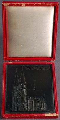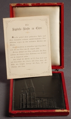 Eisenguss; geschwärzt; Relief; Hochformat; Originalguss der Sayner Hütte 1857; Die anlässlich des Neujahrs 1858 von der Sayner Hütte herausgegebene Plakette zeigt die Ansicht der ehemaligen Stiftskirche St. Mariä Himmelfahrt in Kleve von Südwesten. Die spätgotische Backsteinkirche mit schiefergedeckten Dächern und Turmhelmen ist vom Grundriss dreischiffig, ohne Querschiff und etwa dreimal so lang wie breit (62m lang, 21,5 m breit). Sie wurde bis 1426 erbaut und diente als Hofkirche und Grablege der Grafen von Kleve. Die Neujahrskarte- bzw. Plakette wird aufbewahrt in einem roten, mit Seide ausgeschlagenen Lederetui, das auf seinem Deckel ein goldgeprägtes Muster zeigt. An der Vorderseite dienen zwei Messinghaken und Ösen zum Verschließen des Kästchens. Die Plakettenvorderseite ist beschriftet mit "KAPITELS-KIRCHE ZU CLEVE / SAYNERHÜTTE MDCCCLVIII". Modelleur: Wilhelm Samuel Weigelt.