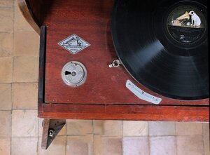 Ein Plattenspieler der, wie bei einem Grammophon, mit Stahlnadeln betrieben wurde, andererseits aber schon einem Elektromotor besitzt. Der Drehteller wird elektrisch angetrieben und verfügt nur über 78 U/pm. Der Tonarm hat auf der Unterseite eine Aufnahme für Stahlnadeln, die mittels Rändelschraube, fest bzw. gelöst werden können. (siehe sep. Bild) Neben dem Drehteller gibt es 2 Metallbehälter zur Aufnahme der verbrauchten Stahlnadeln. Idealerweise sollte nach jeder abgespielten Platte die Nadel ersetzt werden. Da das Objekt keinen eigenen Verstärker hat, mußte der Spieler an ein Radiogerät mit Tonabnehmerbuchse angeschlossen werden. Leider konnten wir weder für das Tonmöbel noch für den Plattenspieler einen Hersteller ausfindig machen. Unser Schallplattenschrank steht auf ca. 12 cm hohen Füßen. Gefertigt aus Holz und dunkel furniert. Optisch ist er zweigeteilt. Im unteren Bereich, hinter einer Tür, ist Platz für jede Menge (Schelllack) Platten.Der obere Teil ist durch einen Deckel verschlossen. Wird dieser nach vorne geklappt, wird der Plattenspieler, samt Grundplatte mit herausgezogen. Links und rechts des Plattentellers sind zwei Logos aufgeschraubt. Zum einen der Markenname „Die Stimme Deines Herrn“ zu anderen ein Reklameschild des Verkäufers, dem Musikhaus Schellenberg aus Trier.