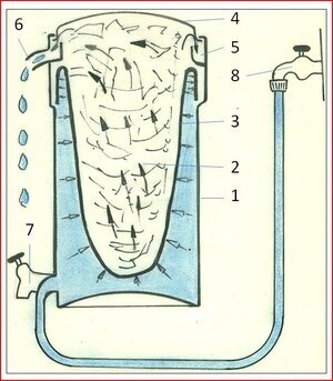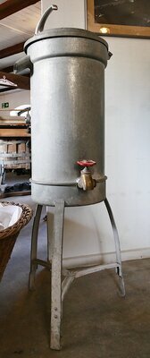 Hydraulische Wäschepresse der Marke Frauenlob (Maschinenfabrik Karl Glemser GmbH ). Die hydraulische Wäschepresse nutzt den Druck des Wasserleitungsnetzes (2–8 bar), um nasse Wäsche zu entwässern. In einen metallenen Zylinder wird ein Gummisack eingehängt und dieser von oben mit der auszupressenden Wäsche gefüllt. Danach wird der Zylinder mit einem Deckel fest verschlossen. Nun wird von unten Wasser aus der Wasserleitung mit Überdruck eingelassen und die Wäsche damit zusammengepresst. Das Wasser aus der Wäsche fliest dann in einen Ringkanal und durch diesen in den seitlichen Ausguss ab. Wenn kein aus der Wäsche ausgepresstes Wasser mehr aus dem Abflussstutzen mehr kann der Wasserhahn (für das Druckwasser) geschlossen werden und der Ablasshahn unten am Zylinder dient zum Ablassen des Druckwassers. Ist und Wenn das Druckwasser abgelaufen ist, kann der Deckel zum Herausnehmen der Wäsche geöffnet werden.