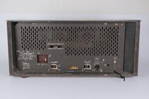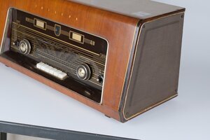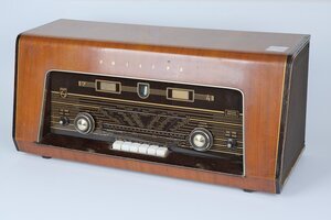 Ein Tischgerät von Philips, Belgien, aus dem Jahr 1956. Das Holzgehäuse ist mittelbraun furniert und fällt durch die gesamte Optik etwas aus dem Rahmen. Verstärkt wird dieser Eindruck durch die fehlenden, üblicherweise nach vorn ausgerichteten Lautsprecher. Bei diesem Radio sind sie seitlich eingebaut und durch ein feines Metallgitter abgedeckt. Ein goldfarbener Metallstreifen, umschließt das komplette Bedienelement. Die Sendestationen sind in goldener Farbe, auf der braunen Glasscheibe gut erkennbar. Zwei große Drehregler, für Lautstärke und Senderwahl, sechs elfenbeinfarbene Drucktasten für die Wellenbereichswahl, (MW/LW/KW und UKW) sowie zwei kleine Drehregler für das Klangbild, bilden das optische Zentrum des Radios. Am oberen Rand befindet sich mittig ein Magisches Auge, flankiert von den Einstellungshilfen für Höhen und Bässe. Rückseitig gibt es ein Schieberegler für die Ferritantenne. Anschlüsse für Plattenspieler, Tonband, Zweitlautspecher sowie Antenne und Erde.