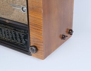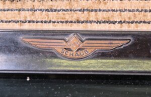 Unser Objekt, ein Schaub Radio, wurde in den Jahren 1939/1940 hergestellt. Das Tischgerät hat ein furniertes Holzgehäuse, dessen Vorderfront durch breite Seitenteile auffällt. Dazwischen, umrahmt ein schwarzer Bakelit Rahmen ein großteil der Bedienelemte. Im oberen Teil, hinter einer Stoffabdeckung, befindet sich der große Lautsprecher, der sich den Platz mit einem Magischen Auge teilt. Unterhalb der Stoffabdeckung, durch einen schmalen Steg abgeteilt, ist die Glasscheibe mit den aufgedruckten Sendestationen. Rechts und links davon, in den seitlichen, hölzernen Rahmen eingebaut, befinden sich zwei Drehregler, mit denen die Lautstärke sowie die Sendereinstellung geregelt wird. In die rechte Seitenwand wurden zwei weitere Dreh/Kippschalter eingebaut, über die sich die Bereiche MW/KW und LW sowie der Plattenspieler ansteuern lassen. Auf der Rückseite sind Anschlüsse für Plattenspieler, Zweitlautsprecher sowie Antenne und Erde eingebaut. In einem Verkaufskatalog ist der Ladenpreis mit 220 RM angegeben.