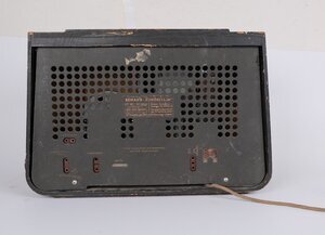Ein kleineres Tischmodell von Schaub aus dem Jahr 1950. Das Holzgehäuse ist mittelbraun furniert. Die Front ist klassisch, horizontal geteilt. Im oberen Teil, hinter einer Stoffabdeckung befindet sich der Lautsprecher. Darunter eine braune Glasscheibe mit aufgedrucken Sendestationen und Wellenbereichen. Seitlich der Scheibe, in das Gehäuse integriert, zwei Drehschalter für die Lautstärke und Senderwahl. Die Wellenbereiche werden über einen Drehschalter gesteuert, der im rechten Seitenteil angeordnet ist. Das Gerät verfügt über LW/MW/KW und ist für den UKW Empfang vorbereitet. Externe Anschlüsse sind für Plattenspieler, Zweitlautsprecher, Antenne und Erde vorhanden. Das Radio kostete im Fachhandel ca. 220 DM. Das Anschlusskabel ist noch Original, d.h. Stoffummantelt und ohne Sicherheitsstecker (Schuko)