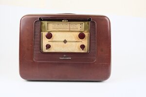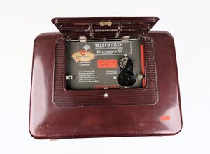 Eines der frühen Kofferradios (Reisegerät) noch mit Röhren bestückt. Hergestllt von Telefunken in den Jahren 1951/52. Mit 5 Kg ist das tragbare Gerät kein Leichtgewicht. Der Rahmen ist aus Holz gefertigt, der mit grauem (Kunst)Leder bezogen wurde. Das Vorder- und Rückteil besteht aus bordeaux farbenen Pressstoffschalen. Das Koffergerät kann mit Netz oder mit Batterie betrieben werden. Auf der Vorderseite befindet sich ausser der Sendestationtabelle und Lautsprecher noch alle Bedienteile. Über Drehregler lassen sich die Lautstärke und die Sender einstellen. Ein Kippschalter ermöglicht den Wechsel zwischen MW/KW und LW. Auf der Rückseite lässt sich erst eine Klappe öffnen, danach die Rückwand abnehmen. So ist ein Zugang zum Batteriefach und dem Netzkabel möglich. Ein Aufkleber im Innern, vom "Elektrofachgeschäftes Pese jr. aus Trier" wurde wohl im Rahmen einer Reparatur angebracht.