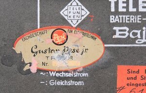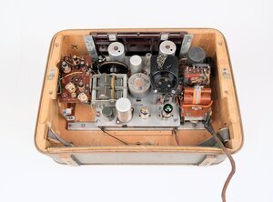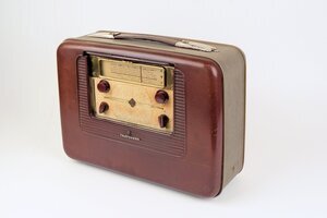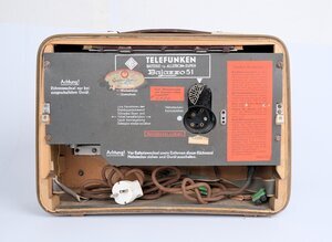 Eines der frühen Kofferradios (Reisegerät) noch mit Röhren bestückt. Hergestllt von Telefunken in den Jahren 1951/52. Mit 5 Kg ist das tragbare Gerät kein Leichtgewicht. Der Rahmen ist aus Holz gefertigt, der mit grauem (Kunst)Leder bezogen wurde. Das Vorder- und Rückteil besteht aus bordeaux farbenen Pressstoffschalen. Das Koffergerät kann mit Netz oder mit Batterie betrieben werden. Auf der Vorderseite befindet sich ausser der Sendestationtabelle und Lautsprecher noch alle Bedienteile. Über Drehregler lassen sich die Lautstärke und die Sender einstellen. Ein Kippschalter ermöglicht den Wechsel zwischen MW/KW und LW. Auf der Rückseite lässt sich erst eine Klappe öffnen, danach die Rückwand abnehmen. So ist ein Zugang zum Batteriefach und dem Netzkabel möglich. Ein Aufkleber im Innern, vom "Elektrofachgeschäftes Pese jr. aus Trier" wurde wohl im Rahmen einer Reparatur angebracht.