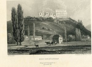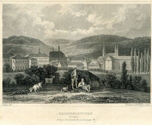 Stahlstich des Klosters Rosenthal. Links unterhalb des Bildmotivs steht die Angabe „Verhas del.“ für lat. delineavit, gezeichnet von Theodor Verhas. Rechts steht „Frommel & Winkles sculp.“ für lat. sculpsit, gestochen von Carl Ludwig Frommel und Henry Winkles. In der Mitte sind die Angaben zum Motiv und Verlag: „Kloster Rosenthal/ (Rheinpfalz) / Verlag v. A.H. Gottschick in Neustadt a.d.H.“. Veröffentlicht wurde der Stich in Franz Weiss: Die malerische und romantische Pfalz, Neustadt 1840. Blick von Osten in die Ruinen des Klosters Rosenthal. Inmitten der Ruinen stehen zwei Männer. Der rechte Mann ist in eine schwarze Kutte gekleidet und trägt einen breitkrempigen Hut. Der linke Mann trägt eine Hose und Kappe. Er steht breitbeinig mit gebeugten Knien da und hält einen großen, runden Korb vor sich hin. Hinter den Männern ist die Ruine der Klosterkirche mit dem eckigen, gotischen Turm in der Mitte. Der Turm ist mit Erkern, Säulen und Kreuzen verziert. Die Spitze schließt ein Kreuz ab. In den zerfallenen Mauern sind Fenster- und Türöffnungen. Das Dach existiert nicht mehr. Vegetation bedeckt den Innenbereich und teilweise die Mauern. Das Kloster Rosenthal, eine Zisterzienserinnenabtei, wurde 1241 durch Eberhard IV. von Eberstein gegründet. Das Kloster überstand Fehden und Kriege bis es 1572, als Nachwirkung der Reformation, durch den protestantischen Landesherrn Graf Philipp IV. von Nassau-Saarbrücken aufgelöst wurde. Ab 1646 lebten noch einmal Zisterzienserinnen in dem Kloster, bis es 1651 wieder durch die Grafen von Nassau aufgelöst wurde. Das Kloster liegt im Ort Rosenthal, der zur Gemeinde Kerzenheim gehört. [Kathrin Koch]