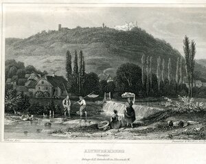 Stahlstich der Ebernburg. Links unterhalb des Bildmotivs steht die Angabe „Verhas del.“ für lat. delineavit, gezeichnet von Theodor Verhas. Rechts steht „Frommel & Winkles sculp.“ für lat. sculpsit, gestochen von Carl Ludwig Frommel und Henry Winkles. In der Mitte sind die Angaben zum Motiv und Verlag: „Ebernburg / bei Creuznach / (Rheinpfalz) / Verlag v. A.H. Gottschick in Neustadt a.d.H.“.Veröffentlicht wurde der Stich in Franz Weiss: Die malerische und romantische Pfalz, Neustadt 1840. Blick vom gegenüberliegenden Ufer der Nahe auf Ebernburg und die gleichnamige Burg. An beiden Seiten des Ufers sind Angler und Fischer. Am Fuße des Burgfelsens liegen vereinzelt Gehöfte. Die Burg ist in ihrem Zustand als Ruine vor den Renovierungsarbeiten zu sehen. Rechts im Stich sind die Felsformationen des Rotenfels zu sehen. Eine genaue Datierung der Ebernburg ist schwierig, da in den frühen Urkunden keine Unterscheidung zwischen Burg und Dorf vorgenommen wurde. 1347 war die erste Nennung der Burg in einer Urkunde. Anfang des 16. Jahrhunderts wurde sie zur „Herberge der Gerechtigkeit“, da dort einige Reformatoren Schutz fanden. Nach dem gescheiterten Feldzug Franz von Sickingens gegen den Erzbischof von Trier wurde die Burg 1523 belagert, geschleift und abgebrannt. 1542 erhielten die Söhne Franz von Sickingens die Erlaubnis zum Wiederaufbau. Nach dem Pfälzischen Erbfolgekrieg wurde sie geschleift und sie verfiel im Verlauf der Zeit zur Ruine. In der Mitte des 19. Jahrhunderts wurden erste Neubauten im pseudogotischen Stil errichtet. Zwischen 1954-1971 erfolgte ein Neubau der Burggebäude. Die historische Bausubstanz wurde nur in geringem Maße berücksichtigt. Die Burg befindet sich im Stadtteil Ebernburg, einem Stadtteil von Bad Kreuznach in Rheinland-Pfalz. [Kathrin Koch]