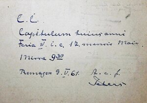Absender der Postkarte ist das Kath. Pfarramt Remagen (Dekanat Remagen), Dr. Peters, und adressiert ist sie an den Bodendorfer Pfarrer Czecholinski. Der Text auf der Rückseite ist ein dreizeiliger Text in lateinischer Sprache und der Unterschrift von Dr. Peters. Auf der Vorderseite in linken Feld ist vermerkt "An Kaplan J. Becker Remagen bezahlt am 17.V.1961" insgesamt sieben Positionen mit Wertangaben für priesterliche Leistungen. Darunter ist ein Stempel aufgedruckt "Geprüft und zur Zahlung angewiesen mit dem handschriftlichen Text -O. Czecholinski, Pf.-"