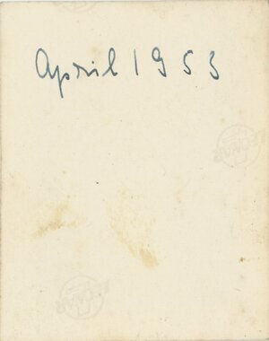 Dieses schwarz/weiss Porträt im Hochformat einer älteren Dame, auf einem Stuhl im Garten sitzend lag in dem Fotoalbum mit dem Eintrag TON 807_1. Die Dame sitzt im einem gemusterten Kleid in der Frühlingssonne in einem noch kahlen Garten, nah an einem Haus. Auf der Rückseite des Bildes steht handschriftlich April 1953. Es kann zufällig in das Album gekommen sein, oder ist es eine der beteiligten Personen des Ausfluges nach Berlin und Potsdam?