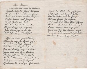 Zwei Liedtexte, die in Anlehnung bekannter Lieder geschrieben wurden. Die Lieder sind auf der Vorder- und Rückseite des Papiers geschrieben. Sie dienten dazu während der Hochzeitsfeier im Anschluss der Trauungszeremonie in geselliger Runde gesungen zu werden. Zu welcher Hochzeit die Dichtung erfolgte, konnte nicht geklärt werden. Das eine Lied "Dem Bräutigam - ist nach dem Lied 'Die Lindenwirtin; Vertonung 1978 von Franz Abt' gedichtet. Das zweite Lied "Den Damen - ist nach dem Kinderlied von 1868 'Wer will unter die Soldaten'; Vertonung Friedrich Wilhelm Kücken" gedichtet.