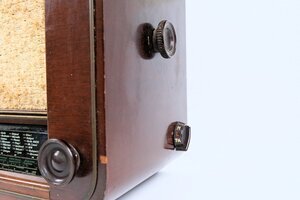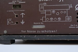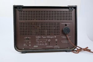 Ein SABA Tischgerät aus den Jahren 1951/1952 mit Holzgehäuse. Dunkel furniert mit abgerundeten Ecken. Im Bereich des Lautsprechers ist ein Magisches Auge eingebaut, das die Sendereinstellung optische unterstützt. Teile der Bedienelemente sind seitlich angeordnet. Dort gibt es zwei Drehschalter für die Wahl der Wellenbereiche. (MW/LW/KW) und die Senderwahl. Die Produktionsnummer ist rückseitig angebracht und lautet 185469. Das Radio ist noch mit dem Originalanschlusskabel (braune Baumwoll Ummantelung) ausgestattet. Bemerkenswert ist der Anschlussstecker für 220 Volt. Der Stecker ist fest mit der Rückwand verbunden und löst sich automatsch bei Abnahme der Rückwand.