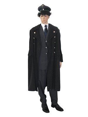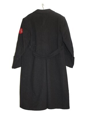 Grauer Woll-Schaffnermantel der Stadtwerke Mainz AG Verkehrsbetriebe mit Revers, und vorderseitig zwölf silberfarbenen Knöpfen (mit Stadtwappen), zwei Knöpfe unter dem Revers. Auf dem linken Ärmel ist außen das rote Mainzer Stadtwappen (mit schwarzer Umrandung und grauen Rädern) aufgenäht. Hersteller des Mantels ist die "UNIFORM A.G. UNAG" (Aufschrift des innenseitig eingenähten Emblems)