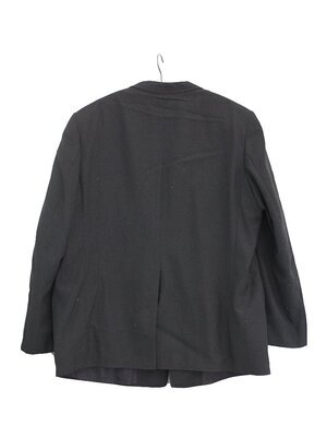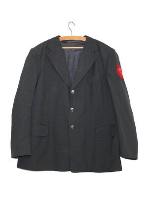 Graufarbene, jackettartige Schaffnerjacke aus Polyester und Schurwolle der Stadtwerke Mainz AG Verkehrsbetriebe aus den 1950er Jahren. Das innenseitige Emblem hat die Aufschrift: "as MODELL Kammgarn TREVISA". Auf dem linken Ärmel ist außen das rote Mainzer Stadtwappen (mit schwarzer Umrandung und grauen Rädern) aufgenäht.