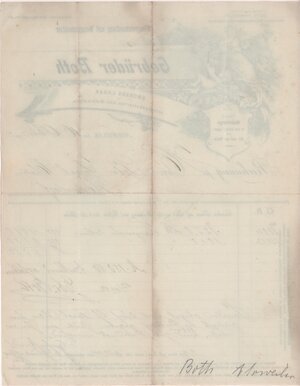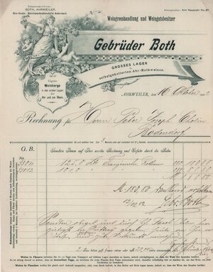 Grafisch hochwertig gestaltete Rechnung an Peter Josef Cholin in Bodendorf für die Lieferung von zwei Sorten franz. Rotwein (226 Liter a´ 0,80 Mark). Auf der Rückseite unten rechts ist der Name des Lieferanten handschriftlich vermerkt.