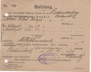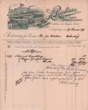 Grafisch hochwertig gestaltete Rechnung an Peter Josef Cholin in Bodendorf für die Lieferung von 619 Liter Landwein im Holzfass. Der Rechnungsbetrag über 804,70 Mark wurde in zwei Raten, 07.03.1899 404,70 Mark und 03.04.1899, bezahlt