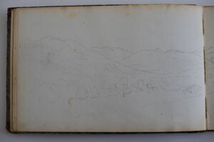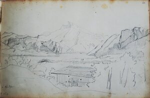 Fortsetzung der Zeichnung nach links auf HM_1988_264_38. Die Darstellung füllt zwei Skizzenbuchseiten. Bezeichnet und datiert am linken unteren Rand: "der Mondsee//21. August" (1843). Ansicht des Mondsees mit der Silhouette der umliegenden Berggruppen. Besonders markant zeigt sich die kantige Spitze des Schafbergs (1782 m hoch) auf der gegenüberliegenden Seite des Sees. Im Vordergrund stehen zwei Holzhütten vor dem flach abfallende Uferstreifen des Mondsees. Durchlaufende Nummerierung jeweils auf der oberen rechten Skizzenbuchseite: hier: "20".