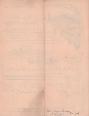 Grafisch hochwertig gestaltete Rechnung, bei der rund 2/3 des Blattes mit dem Briefkopf bedruckt ist. In diesem Rechnungsteil wurde der Empfänger, die Personen, die die Bestellung aufnahmen, handschriftlich eingetragen. Im unteren Drittel des Vordrucks befinden sich neun Zeilen, in denen die berechnete Ware eingetragen werden konnte. Geliefert wurden zwei Fässer, 169 und 155 Liter, zu einem Gesamtpreis von 469,80 Mark. Die Lieferung erfolgte mit der zwei Jahre zuvor in Betrieb genommenen Eisenbahn. Auf der Rückseite ist unten rechts der Lieferant und das Buchungsdatum 28.02.1899 eingetragen.