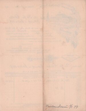Grafisch hochwertig gestaltete Rechnung, bei der rund 2/3 des Blattes mit dem Briefkopf bedruckt ist. In diesem Rechnungsteil wurde der Empfänger, die Personen, die die Bestellung aufnahmen, handschriftlich eingetragen. Im unteren Drittel des Vordrucks befinden sich neun Zeilen, in denen die berechnete Ware eingetragen werden konnte. Geliefert wurde ein Fass, 169 Liter, zu einem Gesamtpreis von 236,60 Mark. Die Lieferung erfolgte mit der zwei Jahre zuvor in Betrieb genommenen Eisenbahn. Auf der Rückseite ist unten rechts der Lieferant und das Buchungsdatum 07.02.1899 eingetragen.