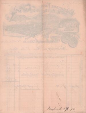 Grafisch hochwertig gestaltete Rechnung, bei der rund die Hälfte des Blattes mit dem Briefkopf bedruckt ist. In der unteren Hälfte des Vordrucks befinden sich die Zeilen, in denen die berechnete Ware eingetragen werden konnte. Geliefert wurden 30 Fässer mit drei verschiedenen Fassungsvermögen zu einem Gesamtpreis von 174,00 Mark. Die Lieferung erfolgte mit der Eisenbahn. Auf der Rückseite ist unten rechts der Lieferant und das Buchungsdatum 77.02.1899 eingetragen.