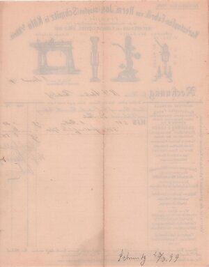 Grafisch hochwertig gestaltete Rechnung, bei der rund 1/3 des Blattes mit dem Briefkopf bedruckt ist. Im unteren Bereich des Vordrucks befinden zwei Spalten. In der linken Spalte wird Werbung für das Sortiment abgedruckt. Im rechten Bereich können die berechnete Ware eingetragen werden. Geliefert wurden 510 Flaschenkapseln zu einem Gesamtpreis von 6,50 Markgeliefert. Die Lieferung erfolgte mit der Eisenbahn. Auf der Rückseite ist unten rechts der Lieferant und das Buchungsdatum 23.2.1899 eingetragen.