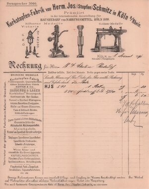 Rechnung der Korkenstopfen Fabrik Schmitz in Köln vom 8. November 1898