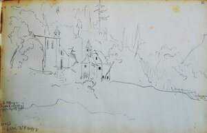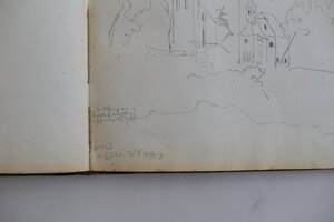 Bezeichnungen am linken unteren Rand: "St. Wolfgang von Kaiser Otto I. anno 972 zum Bischof von Regensburg bestellt. //30. August (1843)// die Einsiedelei von St. Wolfgang"., Eine Auseinandersetzung zwischen Herzog Heinrich II. und Kaiser Otto II. veranlasste Wolfgang, kurz nach seiner Einsetzung als Bischof möglicherweise anderthalb Jahre in Österreich als Einsiedler am Mondsee zu verbringen. Am Falkenstein soll er zurückgezogen in einer kleinen Höhle gelebt und sich dem Gebet zugewandt haben. 1626 wurde um eine Höhle in der Falkensteinwand die heutige Kirche erbaut. Im 16. Jahrhundert war der Falkenstein eine der wichtigsten Pilgerstätten Europas. Fried zeichnete die Wallfahrtskirche, die direkt an den Felsen angebaut wurde. Die Kirche wurde direkt an die Falkensteinwand angebaut (daneben die Skizze eine kleinen Kirche, die an diesem Platz nicht zu finden ist). Durchlaufende Nummerierung jeweils auf der oberen rechten Skizzenbuchseite: hier: "32". HM_1988_264_58, die gegenüber liegende Skizzenbuchseite, ist eine leere Seite.