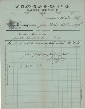 Rechnung der Mälzerei zur Mühle W. Classen in Andernach vom 16. Dezember 1899 an Gastwirtschaft Cholin in Bodendorf/Ahr