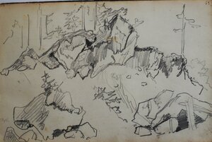 Nummerierung am oberen rechten Rand: "34". Flüchtige Studie einer hügeligen Landschaft mit Burgruine, Bauernhäusern und Bäumen vor der Silhouette einiger Berge (wohl am Wolfgangsee). HM_1988_264_62, die gegenüber liegende Skizzenbuchseite, ist eine leere Seite.