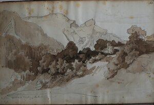 Bezeichnet und datiert unten links: "der hintere vom Schafberg bei St. Wolfgang// 2. September (1843)". Nummeriert am oberen rechten Rand "40". Darstellung der Landschaft um den 1.783 m hohen Schafberg bei St. Wolfgang am Wolfgangsee (Salzkammergut). Durch die Wahl des Bildausschnitts und den kulissenhaften Aufbau der verschiedenen Bergmassive, die er zudem farblich von dunkel im Vordergrund nach hell im Hintergrund differenziert, erreicht Fried eine sehr gute plastische Wirkung im Rahmen der eingesetzten grafischen Mittel. Die Zeichnung setzt sich auf der gegenüberliegenden Seite (HM_1988_264_74) fort.