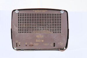 Das Tischradio "Typ Super 560" von Braun wurde in den Jahren 1950/1951 hergestellt. Das Gehäuse besteht aus Pressstoff (Bakelit). Die Einteilung der Vorderseite ist klassisch. Hinter einer Stoffabdeckung der Lautsprecher, darunter die Senderskala. Mit den beiden Drehreglern lässt sich das Gerät einschalten, Laut/Leise stellen, die Wellenbereiche MW/LW/KW und UKW auswählen und Sender einstellen. Das Radio wurde mit einem Magischen Auge ausgeliefert, das der optischen Hilfe bei der Sendereinstellung dient. Externe Anschlüsse gibt es für Plattenspieler, Zweitlautsprecher. Antenne und Erde. Im Fachhandel konnte das Gerät für 228 DM erworben werden. Noch ein kleines Detail ist erwähnenswert. Ausgeliefert wurde das Radio mit dem alten Stecker. Mit der Einführung des "Schuko-Steckers" passten diese nicht mehr und sollten ausgetauscht werden. Aus Kostengründen wurden vielfach die alten Stecker so (gefählich) manipuliert, dass sie wieder passten. (Siehe Bild)