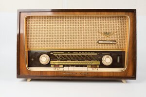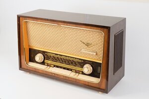 Ein sehr gut erhaltenes Tischgerät der Firma Grundig aus den Jahren 1959/1960. Ausgestattet mit 5 elfenbeinfarbenen Drucktasten, mit deren Hilfe die Wellenbereiche MW/LW/KW und UKW sowie externe Tonquellen zugeschaltet werden können. Zusätzlich kann der Klang individuell über Drucktasten im Bereich des Lautsprechers eingestellt werden. Das Gerät verfügt über 3 Lautsprecher, wovon 2 seitlich abstrahlen. Dadurch wurde der Stereo-Effekt verstärkt. Auf der Rückseite ist ein 5 pol. Dioden Stecker, Anschlüsse für Zweitlautsprecher, Antenne und Erde verbaut. Gekostet hat das Radio 1959 knapp 300 DM