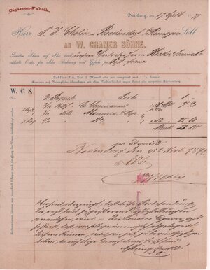 Rechnung der Cigarren-Fabrik W. Cramer Söhne vom 17. September 1878 an Peter Josef Cholin in Bodendorf/Ahr