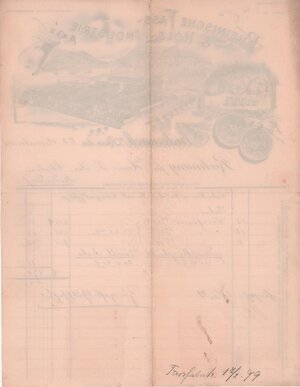 Grafisch hochwertig gestalteter Rechnungsvordruck mit handschriftlichen Einträgen am Peter Josef Cholin in Bodendorf für die Lieferung von 20 Normalsteinen für 2 Mark. Auf der Rückseite der Rechnung steht der Name des Lieferanten und das Datum 15.01.1899. Die Thonwerke Herschenberg lieferten offensichtlich feuerfeste Steine, die für den Ofen der Schnapsbrennerei benötigt wurden.