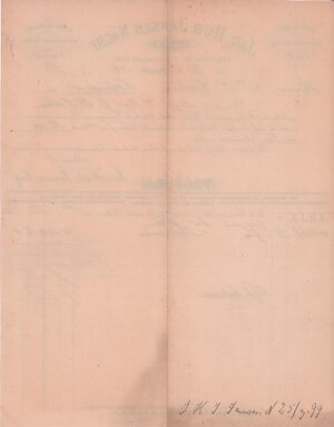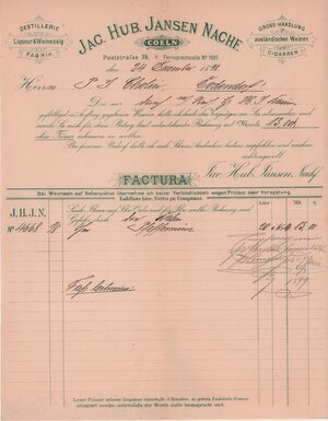 Grafisch hochwertig gestalteter Rechnungsvordruck mit handschriftlichen Einträgen von Jac. Hub. Jansen Nachf. in Köln an Peter Josef Cholin in Bodendorf über die Lieferung von 20 Liter Pfefferminz für 13 Mark. Geliefert wurde mit der Bahn von Köln zum Bahnhof Bodendorf. Bezahlt wurde die Rechnung am 25.3.1899. Die Destillerie Jac. Hub. Jansen Nachf. muss um 1900 von der Likörmanufaktur Alrich übernommen worden sein.