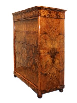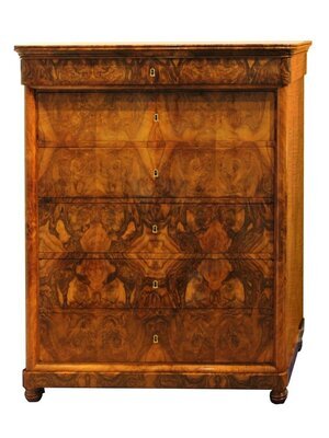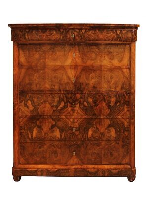 Chiffonniere, eine Sonderform der Kommode, ein Schubladenschrank, der in der Regel mit 7 Schubladen ausgestattet ist. Das sehenswerte Möbelstück wurde um 1840 in der Werkstatt des Mainzer Möbelschreiners Wolfgang Knussmann hergestellt. Es ist aus Tannenholz gefertigt und mit Nussbaumholz in Wurzelmaserung furniert. aus Tannenholz gefertigt und mit Nußbaumholz in Wurzelmaserung funiert. Die Maße betragen 127 cm, Breite 102 cm, Tiefe 49 cm. In Abweichung vom Standard verfügt die Chiffonniere über 6 Schubladen. Johann Wolfgang Knussmann gründete im Jahr 1755 seine Werkstatt in der Augustinerstraße in Mainz (ab 1829 in der Rosenstraße). Der einzige Sohn Friedrich Knussmann lernte ebenfalls Schreiner und arbeitete seit 1818 bei seinem Vater. 1830 wurde er Miteigentümer der Firma. Die Firma entwickelte sich unter der Leitung von Friedrich Knussmann und seinem Schwager Johann Kähler prächtig und wurde sowohl national als auch international durch Beiträge zu den Weltausstellungen 1862 in London und 1867 in Paris bekannt. Nach einem Brand in der Werkstatt wechselte man in ein neues Gebäudeensemble in der Hinteren Bleiche 59 (Mainz). 1869 erfolgte der Eintritt von Johann Wolfgang Kählers Sohn Wolfgang Kähler in die Firma. 1874 verstarb Johann Wolfgang überraschend. Weder die Altvorderen noch die junge Witwe konnten die Firma fortführen. Deshalb wurde die Firma 1874 an die Mainzer Schreiner Johann Heininger und Wihelm Pohl verkauft.