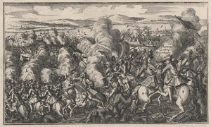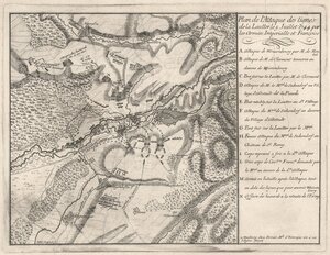 Der Stich illustriert ein Ereignis während des Österreichischen Erbfolgekrieges (1740-1748). Im Frühjahr 1744 überquerte Karl Alexander von Lothringen mit kaiserlichen Truppen an drei Stellen den Rhein und überfiel daraufhin weite Teile des Elsass. Es handelte sich um ein Manöver, um die Franzosen von einem weiteren Einfall in Flandern abzulenken. Der erste der drei Rheinübergänge fand bei Schröck durch ungarische Truppen statt. In der oberen Bildhälfte zeigt eine Karte die Rheingegend von Schröck (heute ein Ortsteil der südpfälzischen Gemeinde Eggenstein-Leopoldshafen) bis nach Mainz. Sie wird ergänzt durch eine Detailkarte mit der Gegend und dem Rheinabschnitt bei Schröck sowie durch eine Detailkarte mit den Städten Weißenburg und Lauterburg im Elsass, die nach dem ersten Rheinübergang von den imperialen Truppen erobert wurden. Eingezeichnet sind hier auch die "Lautterburger Linien", eine 1706 (während des Spanischen Erbfolgekrieges) von den Franzosen im Zickzack angelegte Verteidigungslinie, die zur Verteidigung des für Frankreich neu hinzugewonnenen Elsasses diente. In der unteren Hälfte des Stiches veranschaulicht zusätzlich eine bildliche Darstellung den ersten Rheinübergang: Es sind zahlreiche, mit Soldaten besetzte Boote zu sehen, die gerade übersetzen, und französischen Truppen, die die Flucht ergreifen. [Johanna Kätzel]