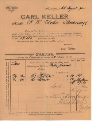 Rechnung von Carl Keller in Remagen über 57,60 Mark vom 25. August 1900 an Peter Josef Cholin in Bodendorf/Ahr