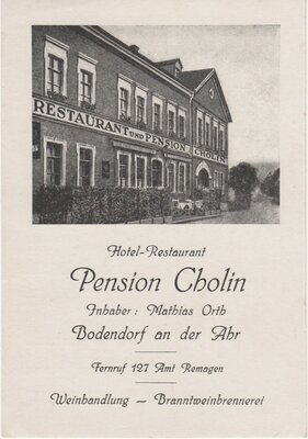 Auf der Vorderseite ist die alte Außenansicht des Gebäudes zu sehen. Seit dem Bau des Gebäudes 1881 hatte sich am Gebäude nicht verändert. Vor dem Gebäude waren zur Straße hin Pflanzenküber gestellt und damit die Tische vor dem Gebäude zur Straße hin abgeschirmt. Auf der Rückseite war Platz für die rechnungsschreibung. Die vorliegende Rechnung wurde ausgestellt für den Damen Kegel-Club mit 11 Essen und 2 Lieter Rhein-Wein.