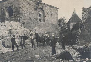 Die Schwarzweiß-Fotografie zeigt Reste der aus dem 17. Jh. stammenden Festungsanlagen in Landau. Zu sehen ist ein Teil der Fortmauer. Die Fotografie kam 1919 in den Bestand des Historischen Museums der Pfalz und ist vermutlich auch im selben Jahr entstanden. Von 1919 bis 1921 wurden nochmals in größerem Stil Reste der Festung abgetragen. Der größte Teil der Anlage hatte jedoch bereits in den Jahren 1871-1895 weichen müssen, um das Wachstum Landaus nicht mehr einzuschränken. Einzelne Bauwerke der barocken Wehranlage, wie etwa das Französische Tor und das Deutsche Tor, sind allerdings bis heute erhalten. Das verteidigungsstrategisch bedeutsame Landau gehörte ab 1680 (mit einigen Unterbrechungen bis 1815) formal zu Frankreich und wurde unter Ludwig XIV. zwischen 1688 und 1691 zu einer Festung ausgebaut. Die Pläne stammen vom Marschall und Festungsbaumeister Sébastien Le Prestre de Vauban. Ausführender Baumeister war Jacques Tarade. Die Landauer Festung gehörte zum "Eisernen Gürtel" ("ceinture de fer"), einem durch zahlreiche Festungen gesicherten Verteidigungsnetz zum Schutz der französischen Grenze, das zwischen 1665 und 1707 von Vauban geschaffen wurde. [Johanna Kätzel] Aufgenommen, wer: Fritz Seifert (?) im frühen 20. Jh. in Landau in der Pfalz tätiger Fotograf