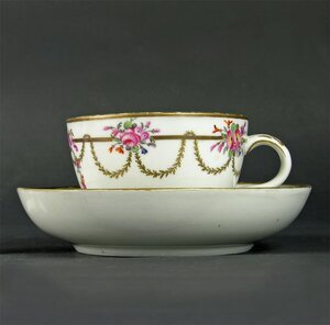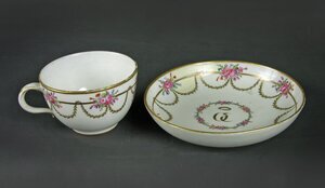 Die Teetasse mit passender Untertasse ist mit Blütenbouquets und goldenen Festons verziert, die zu den typischen Ornamenten des Klassizismus bzw. des Empire gehören. Auf dem Spiegel der Untertasse befinden sich unter einem Lorbeerkranz die Initialen "OE". Tasse und Untertasse wurden in der 1735 gegründeten Porzellanmanufaktur in Niderviller in Lothringen (heute Département Moselle) hergestellt. Bei der Niderviller Fayencerie handelt es sich um eine der ältesten Steingutfabriken in Lothringen, die häufig mit der königlichen Fayencerie in Sèvres verglichen wurde. Kurz nach der Jahrhundertmitte wurde die Manufaktur an Jean-Louis Beyerlé, den Direktor der königlichen Münzprägeanstalt in Straßburg verkauft. Er holte sich neue Mitarbeiter und damit "Knowhow" u.a. aus Wien und Frankenthal, konnte die Produktion verbessern und eröffnete eine Niederlassung in Straßburg. 1770 kaufte General Adam-Philippe de Custine die Manufaktur. Um 1792 ist die Blaumarke mit zwei gespiegelten und ligierten "C"s unter einer Krone nachweisbar, anhand der die vorliegende Tasse datiert werden kann. Nach Custines Hinrichtung wurde François-Henri Lanfrey Geschäftsführer, der die Produktion steigern und Porzellan bis nach Russland lieferte. Heute gehört die Fayencerie zur französischen Gruppe Faïence & Cristal de France. [Johanna Kätzel]