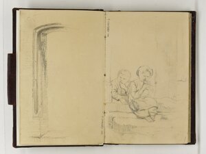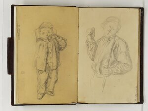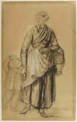 Vorstudie zu einer Dame, möglicherweise handelt es sich um ein Porträt der Nichte des Malers - Anna Runck- auf der rechten Seite des ausgeführten Gemäldes. Sie steht im Vordergrund und führt ein Kind an der Hand. Die schwungvolle Kopfbedeckung wird im späteren Gemälde zu einem großformatigen Hut hin verändert. Die rechte Seite (HM_1988_263_30) zeigt den Ast eines Baumes mit angedeuteten Blättern (ggf. einer Robinienart, wie sie in der Pfalz als Sträucher und Bäume häufig vorkommen).