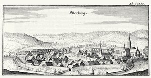 Bezeichnung "OTTERBVURG" am mittleren oberen Bildrand. Unbekannter niederländischer Zeichner aus dem Umkreis Anton Mirous. Darstellung der Ortes Otterberg bei Kaiserslautern mit der spätromanischen Abteilkirche rechts im Bild. Das Zisterzienserkloster war zum Zeitpunkt der Darstellung (als Ergebnis der Reformation) bereits aufgelöst worden und befand sich im Besitz der Kurpfalz. Pfalzgraf Johann Casimir hatte dort bereits ab 1579 reformierten Glaubensflüchtlingen aus den südlichen Niederlanden gestattet sich dort anzusiedeln. Die Zeichnung steht im Zusammenhang mit dem Gemälde eines unbekannten Künstlers aus dem Umkreis von Anton Mirou im Besitz der Bayerischen Staatsgemäldesammlungen (Standort Historisches Museum der Pfalz), siehe BSTG_02640 und einem Kupferstich, der für die Topographia von Matthäus Merian von 1679 entstand. siehe BStG_02640 (https://nat.museum-digital.de/index.php?t=objekt&oges=230643 und Merian 1672 (https://de.m.wikipedia.org/wiki/Datei:Merian_Otterberg.jpg ).