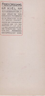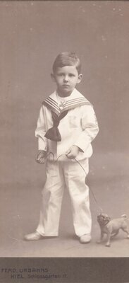 Zu sehen ist ein Junge von etwa zehn Jahren. Er posiert in einem Fotoatelier und hält einen kleinen Spielzeughund an der Leine. Seine Haare sind links gescheitelt. Er ist mit einem weißen Matrosenanzug bekleidet. Der echte Kieler "Matrosenanzug" wurde zum Symbol des bürgerlichen Nationalstolzes. Kinder trugen den Anzug zu jeder Gelegenheit, und demonstrierten damit den Patriotismus ihrer Eltern. Das Foto ist auf ein Stück Pappe geklebt, auf dem der Name und der Sitz des Fotoateliers vermerkt sind.