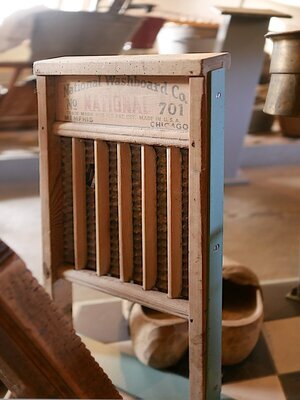 Waschbrett - Type "the Zinc King 701" Waschbrett hergestellt von der National Washboard. Rahmen aus günstigem Holz, Riffelbrett aus Zink. Beschriftung Vorderseite: THE ZINC KING TOP NOTCH SANITARY FRONT DRAIN Beschriftung Rückseite: National Washboard Co. No NATIONAL 701 TRADE MARK REG U.S. PAT. OFF. MADE IN U.S.A. MEMPHIS CHICAGO Der Hersteller: Waschbretter sind seit dem 19. Jahrhundert bekannt. Der Rücken eines Waschbretts war ursprünglich aus Holz, ein erstes Patent eines geriffelten Riffelbretts aus Metall stammt aus dem Jahr 1833. Die industrielle Produktion von Waschbrettern begann um 1900 und hatte die Verbreitung von Waschbrettern in fast allen Haushalten zur Folge. Die National Washboard Company war ein Konglomerat aus 3 Unternehmen die in den ersten Jahren des Jahrhunderts gegründet wurden und 1907 ihre Aktivitäten koordinierten. Der Firmensitz war in Chicago, produziert wurde in Saginaw MI und Memphis TN. Nach eigenen Angaben prodzierte sie 1918 am Tag 125.000 Waschbretter und war der weltweit größte Hersteller. Der Niedergang begann, als ab den 1920er Jahren Waschmaschinen für die Mittel- und Oberschicht und ab den 1950er-Jahren in Industrieländern auch für alle erschwinglich wurden und Waschbretter hier nur noch als Musikinstrument eine Verwendung fanden. Da die Waschbretter der 700er-Serie und insbesondere auch das Modell 701 auf Grund ihre schönen Klangs bei Musikern sehr beliebt waren und das Waschbrett weit überdurchschnittlich gut erhalten ist, ist davon auszugehen, dass dieses Waschbrett als Musikinstrumet in unsere Gegend gekommen ist. Möglicherweise von Amerikanischen Soldaten oder Musikern in der Nachkriegszeit. Oder es wurde von einer Deutschen Skiffle-Band bestellt, die für ihre Musik ein Originalinstrument haben wollte.