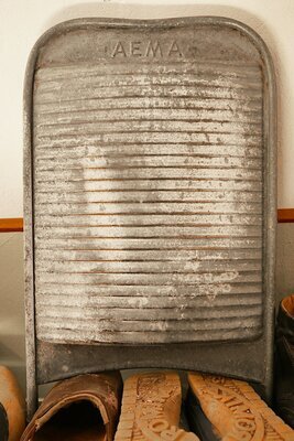 Waschbrett AEMA: Komplett aus verzinktem Stahlblech hergestellt im Vollbad hellglänzend verzinkt mit gewölbtem Riffelbrett. Preise 1933: 1.40 Reichsmark ohne Haken 1.50 Reichsmark mit Haken Kurze Firmengeschichte: Gründung des Unternehmens als Kolonialwarenhandlung im Jahr 1851. Ab 1855 Produktionsbetrieb. Wurde 1928 in der Weltwirtschaftskrise insolvent. 1932/33 nach Kapitalschnitt weiterbetrieben. Nach Übernahme mehrerer Unternehmen und Niederlassungen im Ausland wurde das Unternehmen 1979 von der Fissler GmbH übernommen und das Werk in Annweiler 1992 stillgelegt.