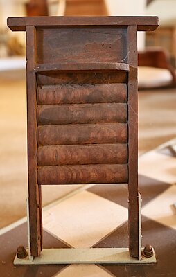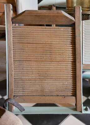 Einfaches, ganz aus Holz gefertigtes Waschbrett. Statt eines Riffelbretts sind Stäbe vorhanden an denen die Wäsche gerieben wurde. 2 identische Exemplare vorhanden. Eher aussergewöhnliches Waschbrett, das ganz aus Holz gefertigt ist. Entweder es ist relativ alt (vor 1900) oder es wurde in Zeiten von Materialmangel in der Zeit des Ersten oder Zweiten Weltkriegs gefertigt.